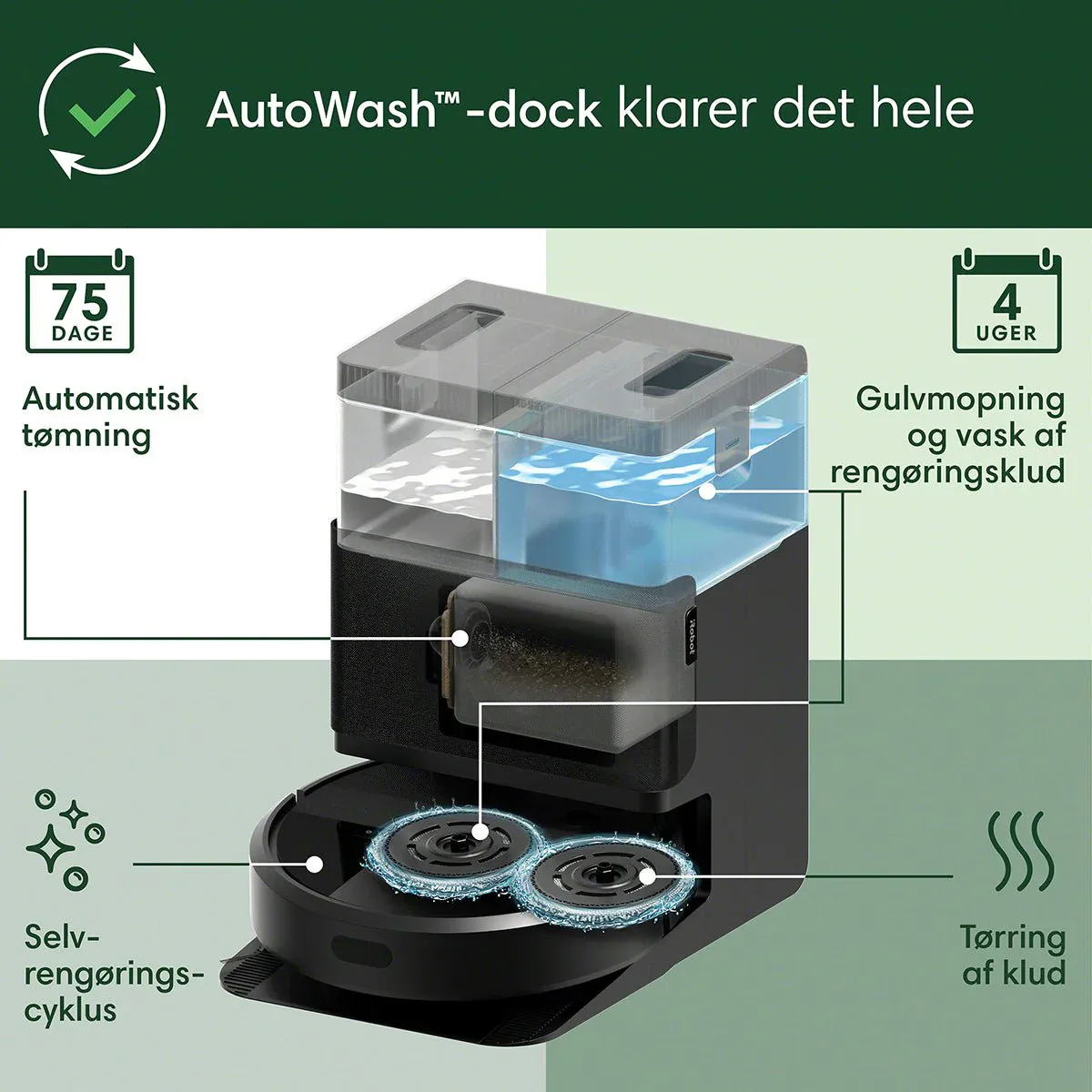 Automatisk tømning af støvbeholderen (kapacitet op til 75 dage) og automatisk vask og tørring af moppepuder (op til 4 uger uden vedligeholdelse). Mindre tid på vedligeholdelse, mere tid til det, der betyder noget!
